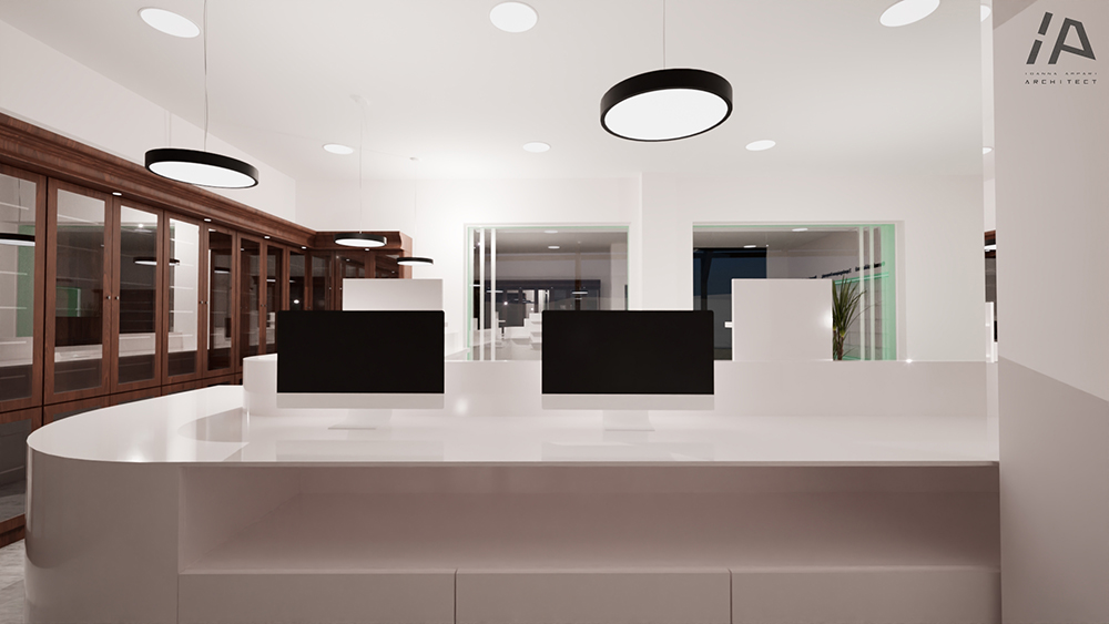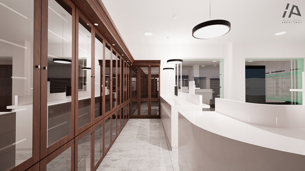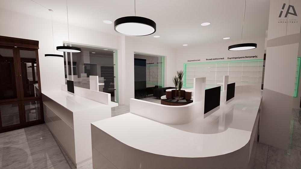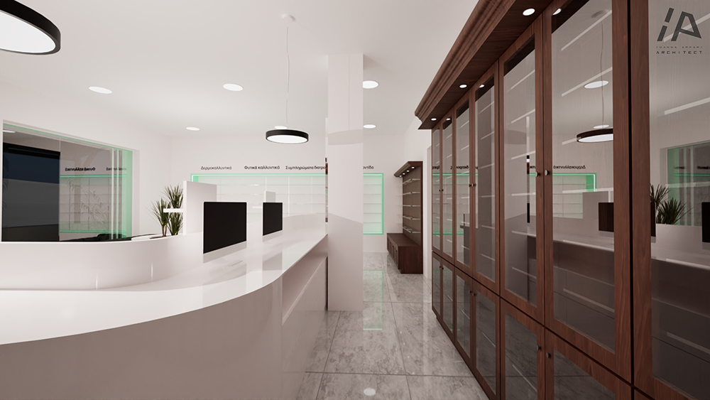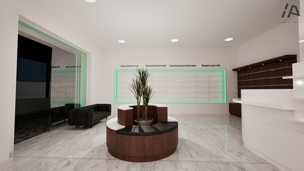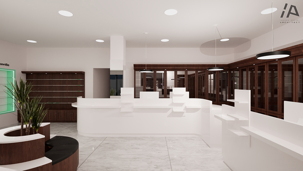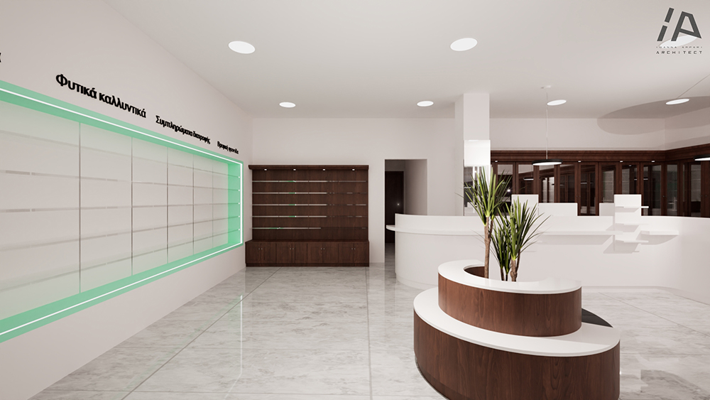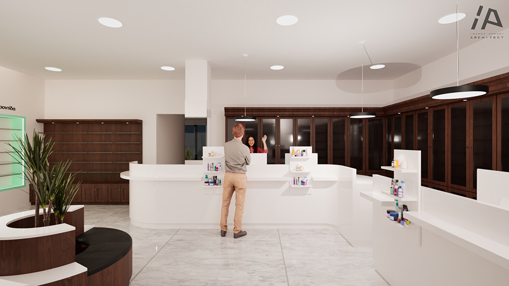 Σχεδιασμός Φαρμακείου Η προτεινόμενη σχεδίαση του φαρμακείου συνδυάζει καθαρές, σύγχρονες γραμμές με μια αίσθηση ζεστασιάς και λειτουργικότητας. Ο κεντρικός λευκός πάγκος δημιουργεί έναν φιλόξενο χώρο εξυπηρέτησης, ενώ τα καμπύλα στοιχεία και οι φωτεινές επιφάνειες ενισχύουν την αίσθηση καθαρότητας και ευρυχωρίας. Τα σκούρα ξύλινα ντουλάπια περιμετρικά προσθέτουν κομψότητα και πρακτικό αποθηκευτικό χώρο, δημιουργώντας μια ισορροπία ανάμεσα στο μοντέρνο και το κλασικό. Ο έξυπνος φωτισμός, οι οργανωμένες ραφιέρες προϊόντων και η άνετη ζώνη αναμονής με φυτά συμβάλλουν σε μια ευχάριστη εμπειρία για τον επισκέπτη, αναδεικνύοντας έναν χώρο που είναι ταυτόχρονα λειτουργικός, αισθητικά προσεγμένος και φιλικός προς τον χρήστη.